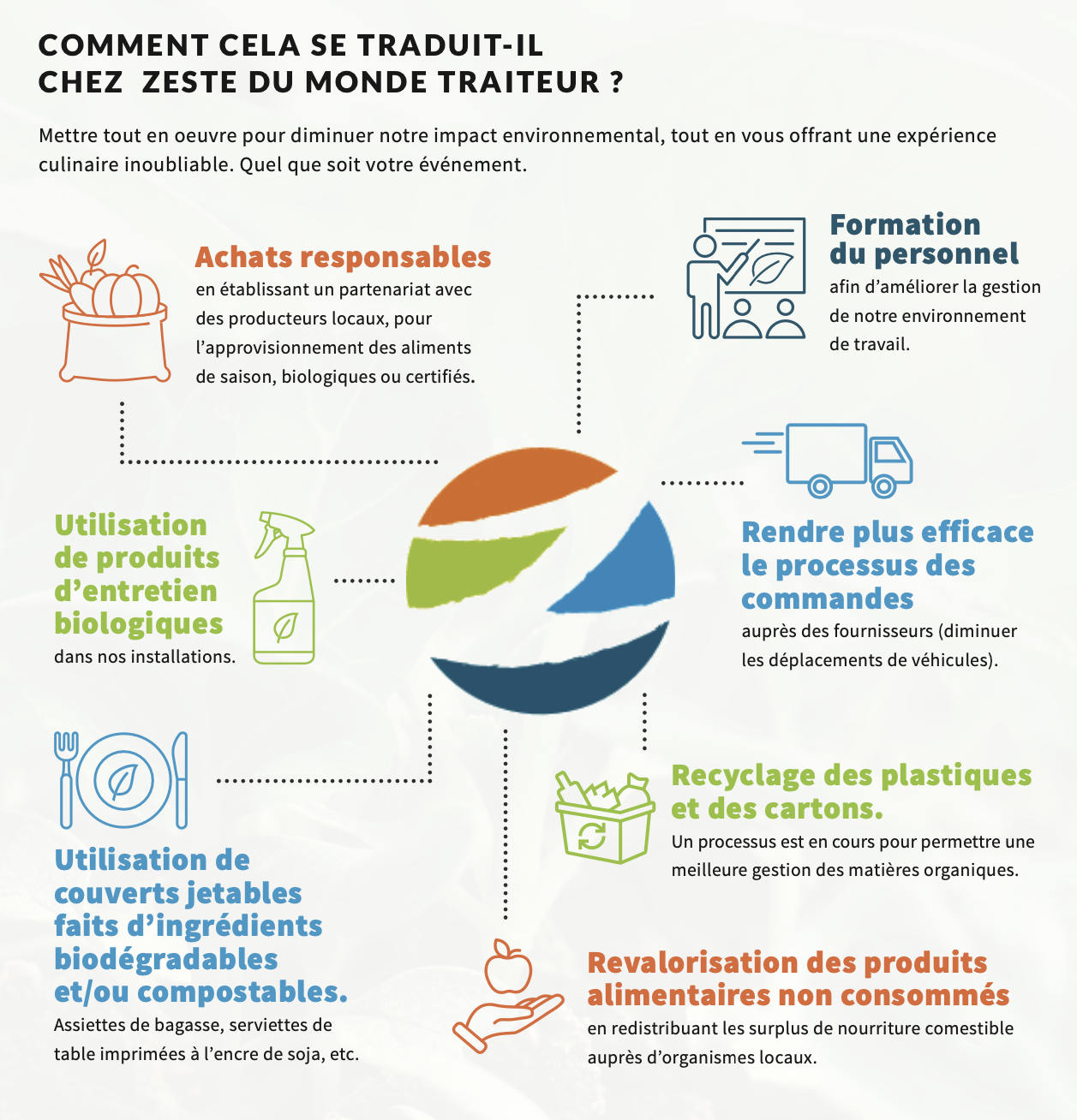 Chez Zeste du Monde, le souci de la qualité ne s’arrête pas à la nourriture que nous confectionnons ou à notre service client et celui de la livraison. Nous cherchons sans cesse des façons de bien servir l’environnement aussi et il est de notre devoir de partager cette responsabilité avec vous.